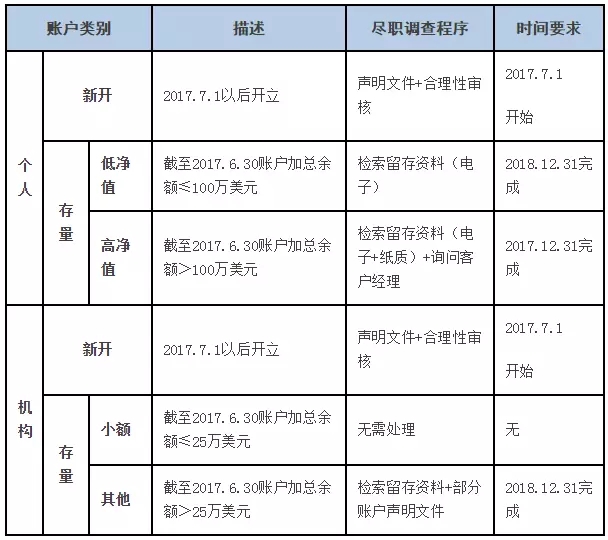 賬戶調(diào)查時(shí)間2017年12月31日前,完成對存量個人高凈值賬戶(截至2016年12月31日金融賬戶加總余額超過100萬美元)的盡職調(diào)查;
