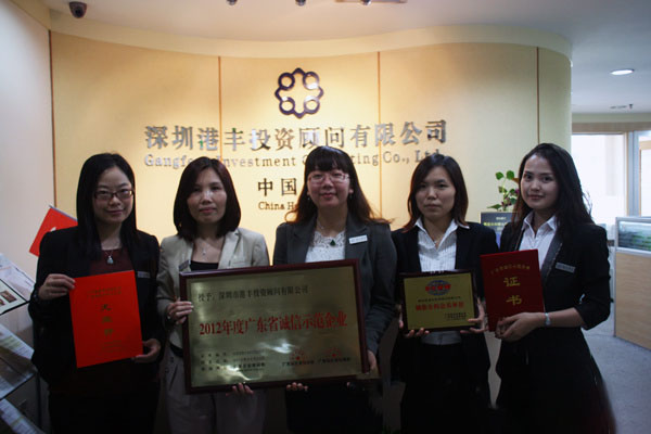 我司榮獲了“2012年廣東省誠信示范企業(yè)”榮譽(yù)稱號,成為行業(yè)內(nèi)首家獲此殊榮的企業(yè),港豐總經(jīng)理魏曉嶸和副總經(jīng)理葉惠霞授領(lǐng)榮譽(yù)牌匾和證書。